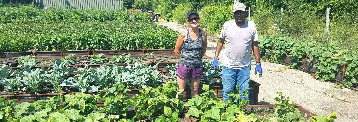 In Detroit, from 2012-2020 we grew over a million servings of vegetables for homeless shelters and our neighbors. Our main garden- “Big Glen”- contained 800 raised beds (parts bins donated by General Motors) on an abandoned parking lot the size of a football field. Read more about Buckets of Rain in Detroit.